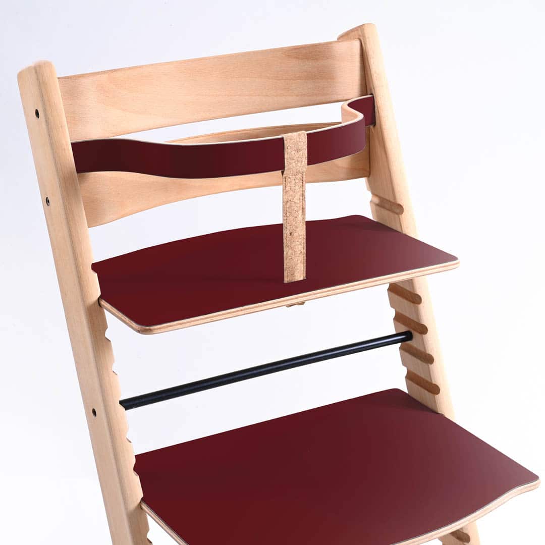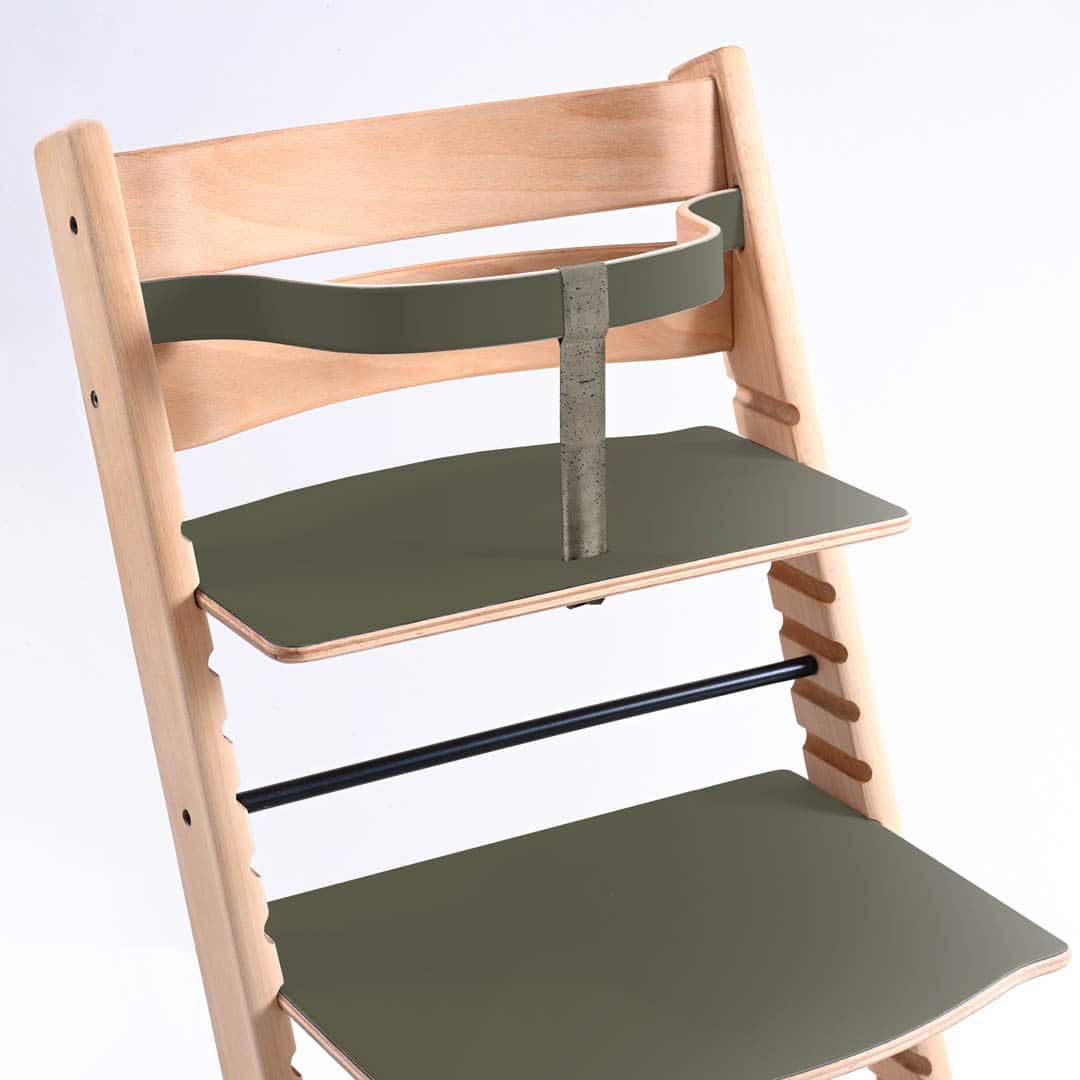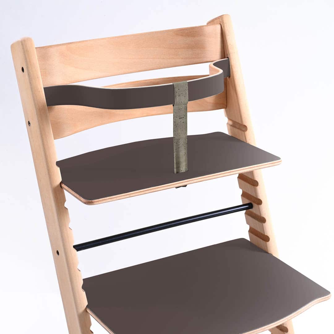 Vores ny designet Trip Trap bøjle samt plader er fremstillet af formspændt bøgetræ hvor efter der er lagt linoleum på både bøjle og plader som efter følgen er oliebehandlet. Kombinationen af træets styrke og linoleummets holdbarhed giver bøjlen og plader, både sit rustikke, smukke og farverige udtryk.