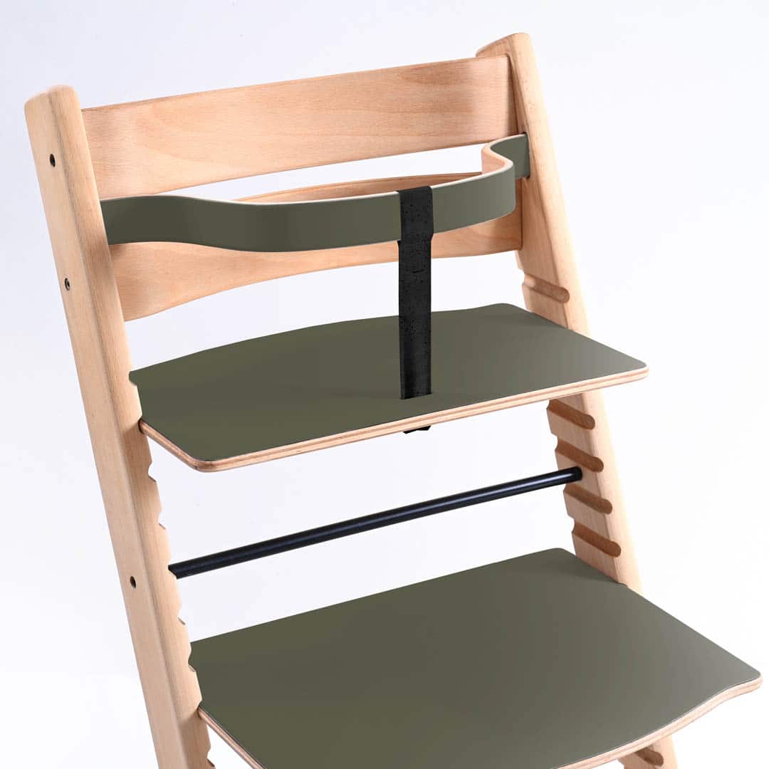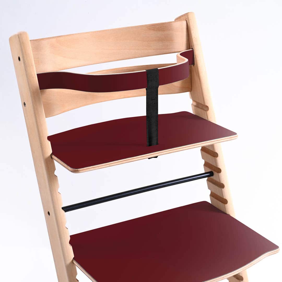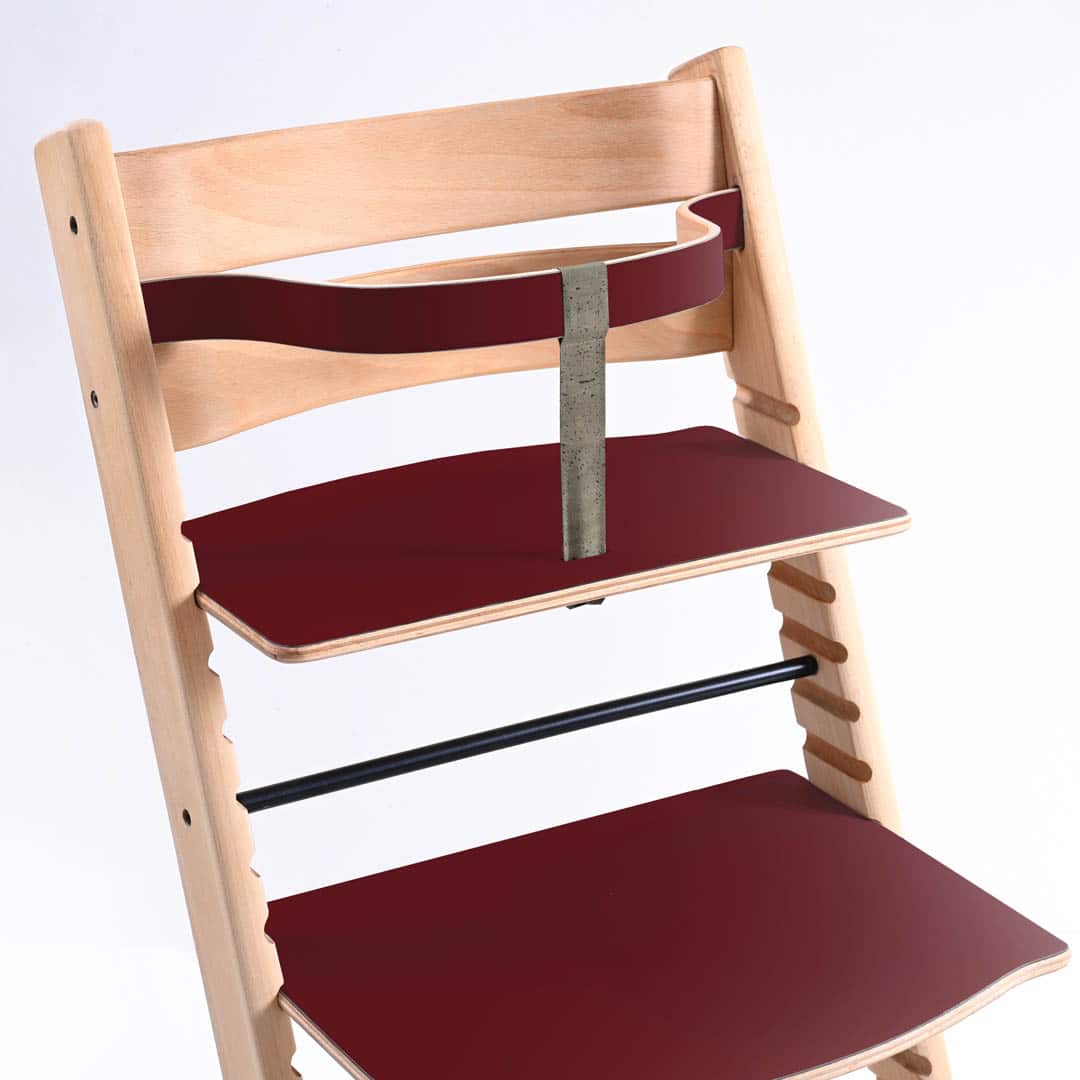 Vores ny designet Trip Trap bøjle samt plader er fremstillet af formspændt bøgetræ hvor efter der er lagt linoleum på både bøjle og plader som efter følgen er oliebehandlet. Kombinationen af træets styrke og linoleummets holdbarhed giver bøjlen og plader, både sit rustikke, smukke og farverige udtryk.